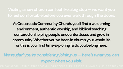 We believe church is a place for everyone — no matter your background or where you are in your faith journey. At Crossroads, our goal is to create space where people can encounter Jesus and grow in community.